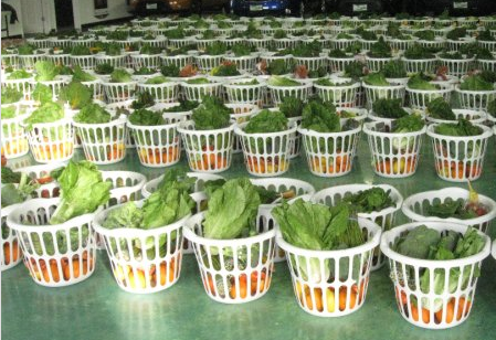 The picture below shows how they set it up- ours was in a local charter school gym. There are 2 baskets side-by-side, one has fruit & one veggies. They line up the baskets. You bring your own container to carry your food home in & empty it from the baskets into your container.
